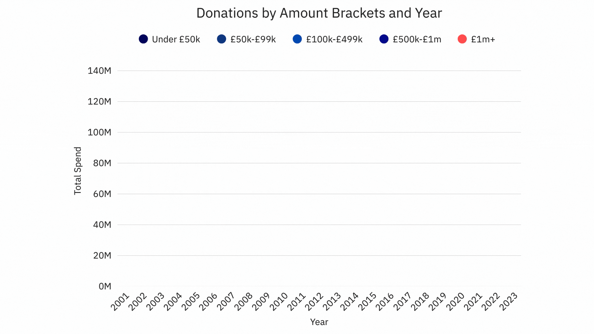 So how does political election spending feed into this? In a race to the bottom of donors pockets, political parties are focusing on securing donations from a small number of very wealthy individuals. While historically donations from those giving £1 million or more in a year have formed a modest proportion of overall contributions, they have been increasing significantly in recent years, and in 2023 they formed the majority of donations: